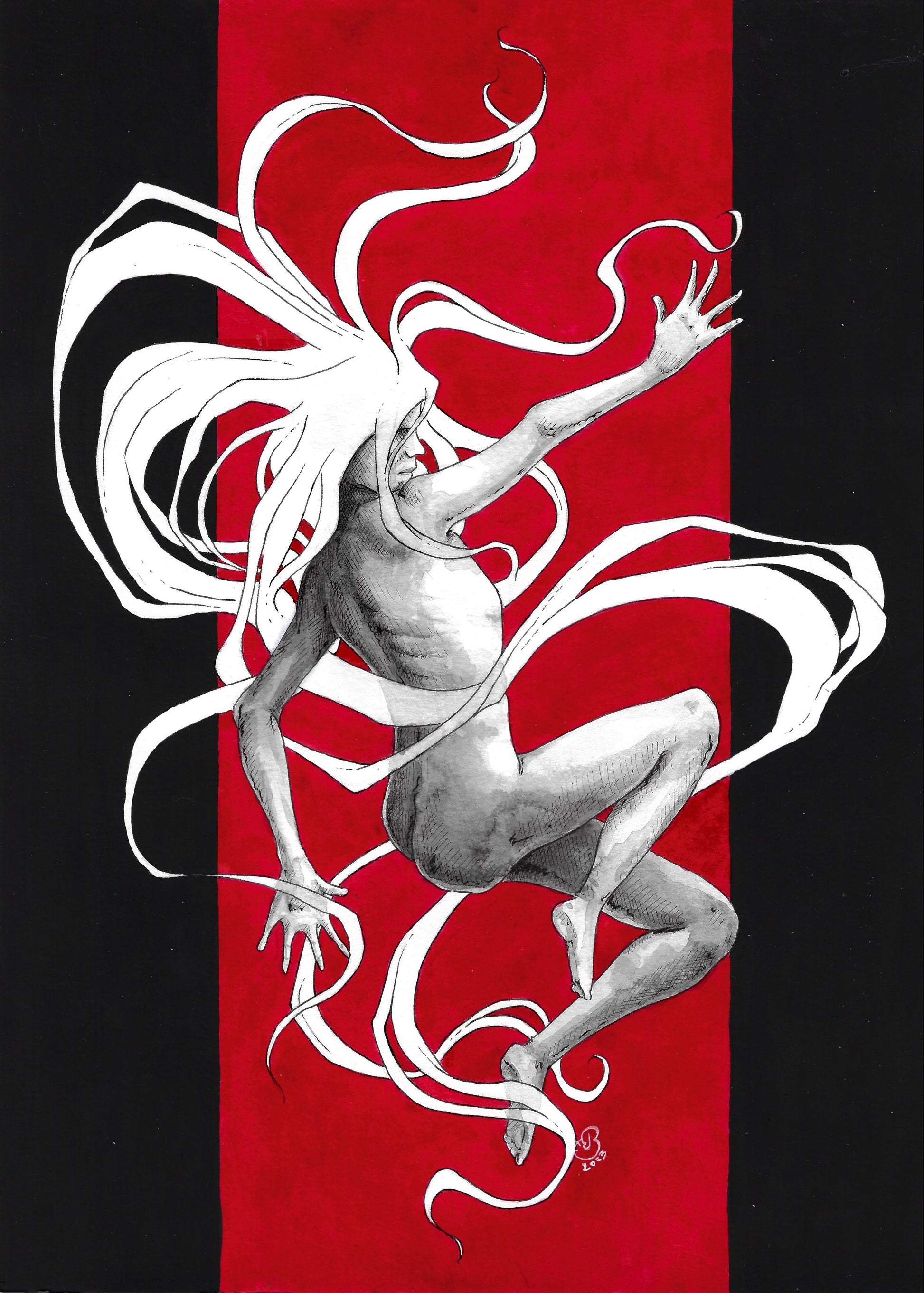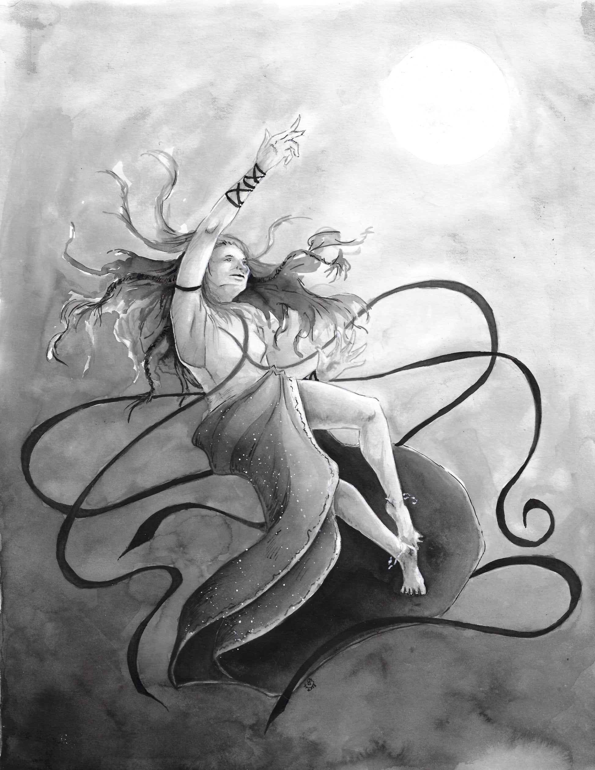 Part to full body of subject with design elements, often having a splash of color or metallics.